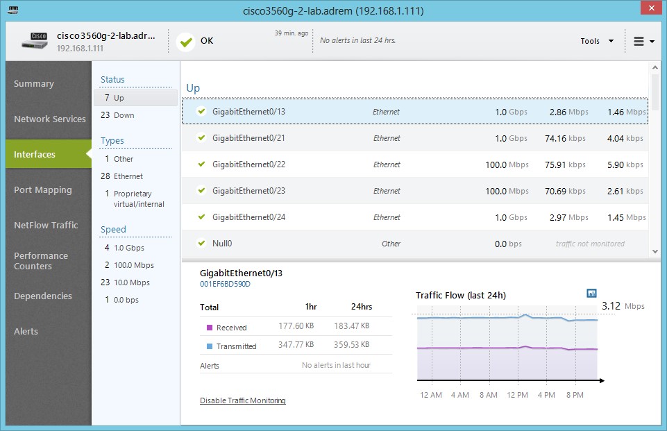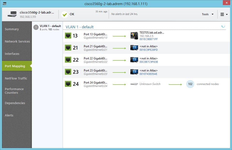 Мониторинг состояния и здоровья сетевых устройств осуществляется с помощью протокола SNMP. Поддерживаются все версии протокола SNMP – v1, v2, v3. Для того, чтобы понимать сетевые устройства и точно обрабатывать информацию, NetCrunch имеет в библиотеке более 3500 предустановленных MIB баз.