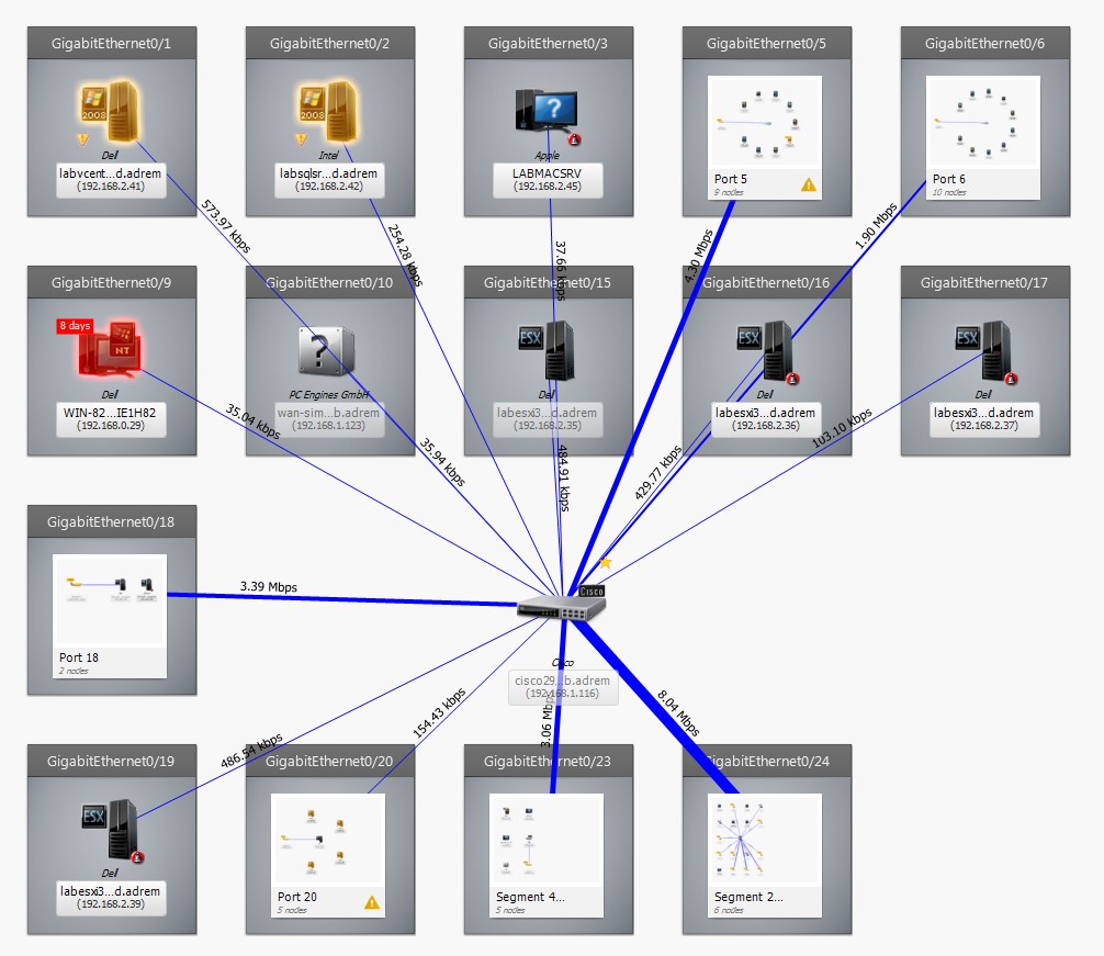 После развертывания сервера NetCrunch он в автоматическом режиме позволяет обнаружить все устройства, которые подключены к сети. После обнаружения любого устройства в сети, NetCrunch проверит его состояние и поддержку протокола SNMP и затем в зависимости от типа устройства назначит автоматически список метрик для мониторинга, которые нам интересны. Списки метрик можно использовать как преднастроенные так и свои собственные. После окончания процесса обследования сети мы сможем увидеть карту сети на Уровне 2 сетевой модели OSI, что позволит поддерживать информацию о соединениях в сети в актуальном формате.