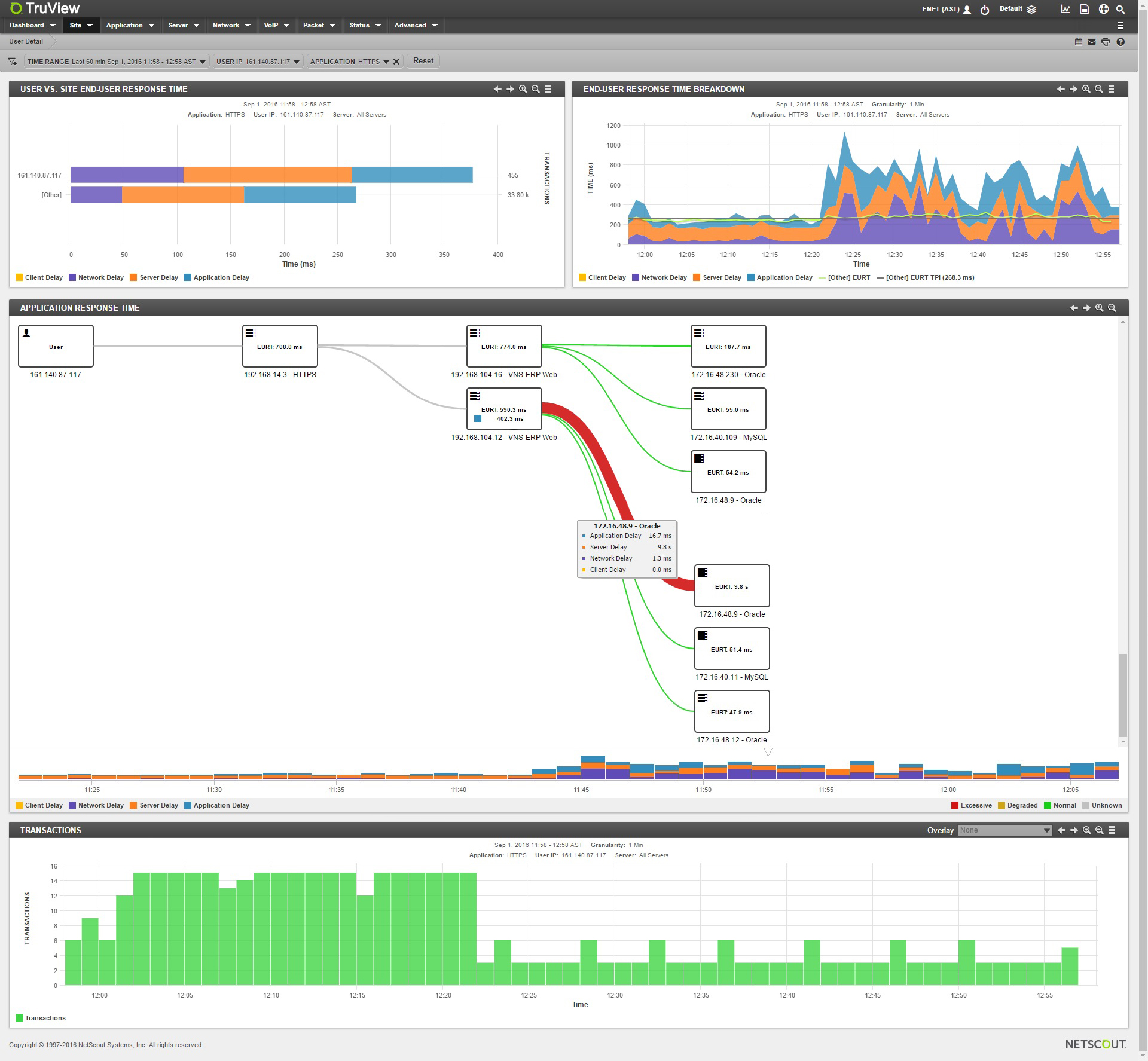 NETSCOUT TruView – круглосуточно отслеживает время отклика приложений для каждого пользователя, сайта или группы серверов по всему предприятию, отображая место и время возникшей проблемы. Благодаря накопленной статистике, система автоматически рассчитает базовую производительность каждого компонента ИТ-инфраструктуры для каждого момента времени. Все последующие отклонения производительности будут анализироваться относительно данного уровня, что позволит обнаружить наличие проблем в работе ИТ-инфраструктуры и своевременно принимать решения, кто должен эту проблему решать – провайдер, группа поддержки приложений или группа поддержки сетевой инфраструктуры.